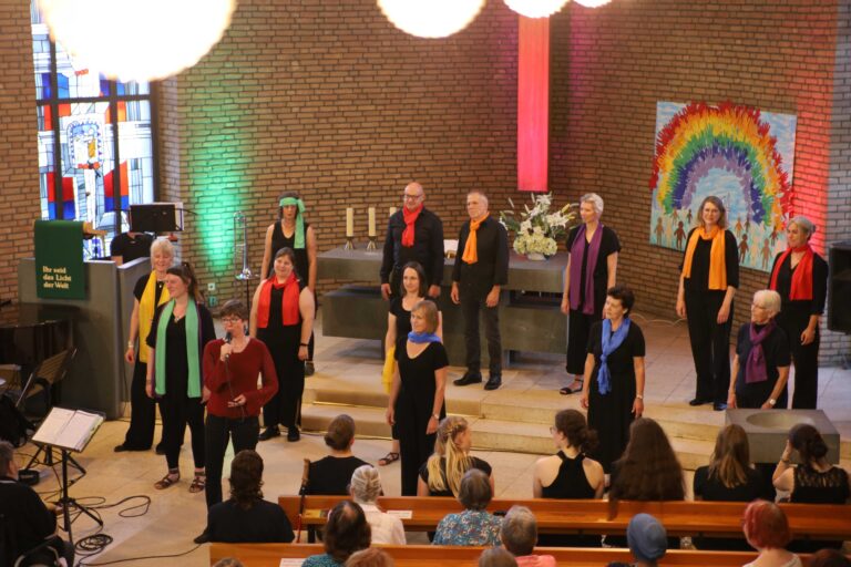 In den Farben des Regenbogens präsentiert sich der Gospelchor bei seinen Auftritten. Regelmäßig gestaltet der Chor besondere Gottesdienste in allen Gemeindebezirken und lädt zu Gospelkonzerten und Workshops ein.
